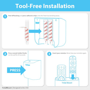 AUÐVELT Í UPPSETTINGU án verkfæra og án þess að bora göt í vegginn. Þessi einkaleyfisvarði fjarstýringarhaldari gerir kleift að geyma fjarstýringuna til langs tíma, en sérstaka límið er auðvelt að fjarlægja með því að toga í flipana. (Skrúfur fylgja einnig með en eru ekki ráðlagðar.)